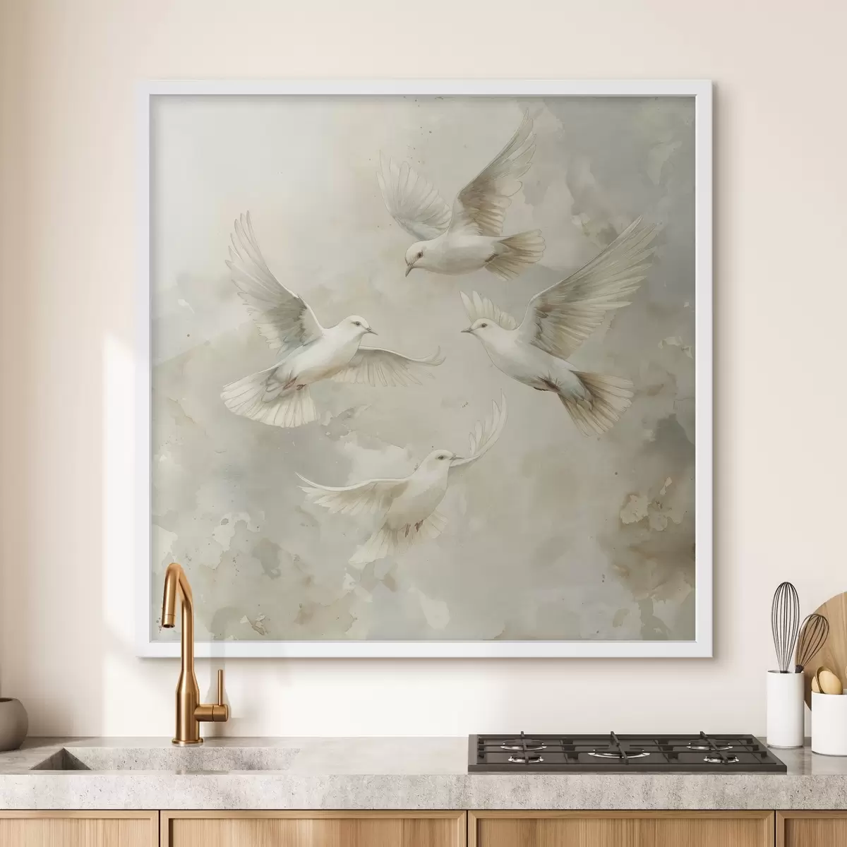 Poster Akvarell repülő madarak, finom bézs és fehér színek, galambok Nr f39976