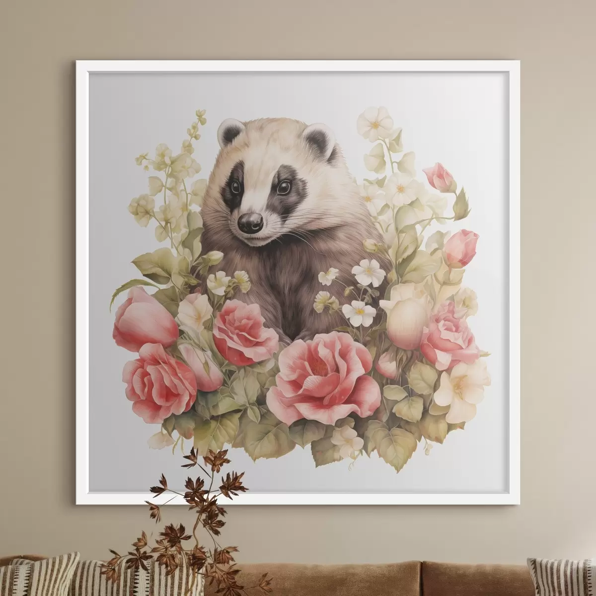 Plakát a sziklán Borz portré rózsaszín vízfestékkel és szüreti rózsákkal f40094