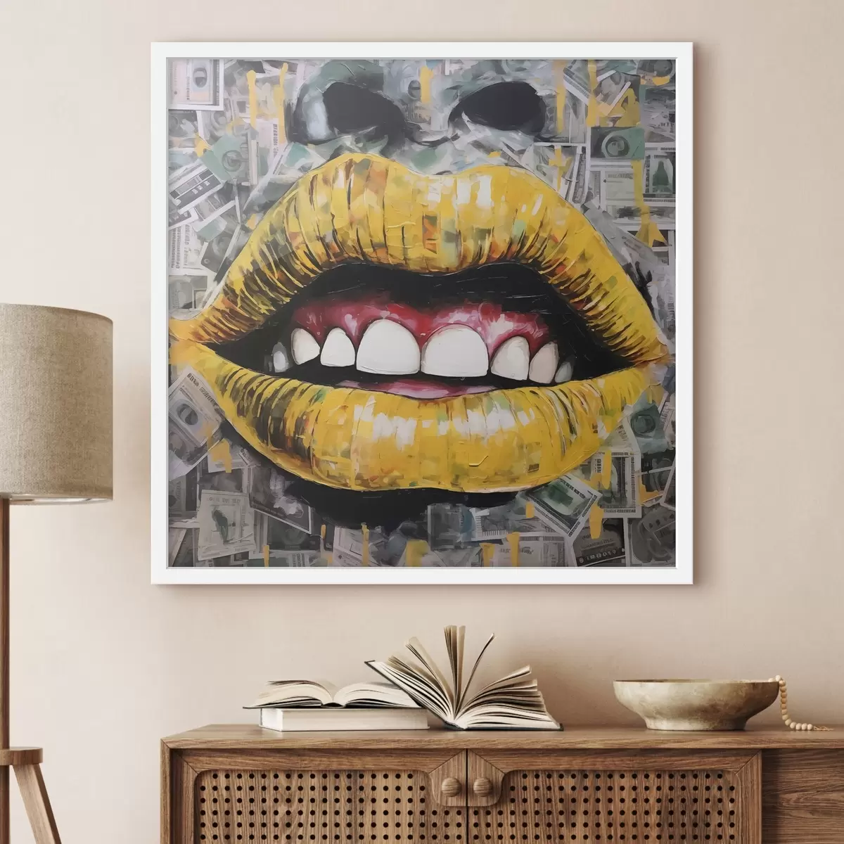 Poster Sárga ajkak, fehér fogak, olajfestményt utánzó bankjegyek arca Nr f40098