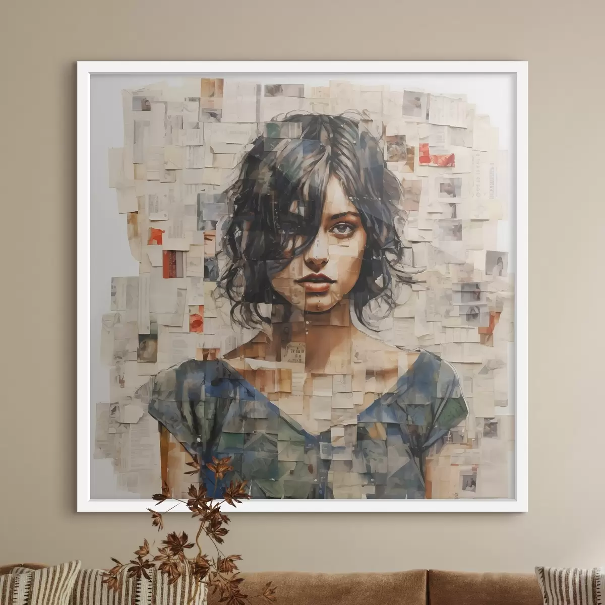 Poster Lány göndör hajjal, matricákkal, bélyegekkel és vonalkóddal borítva Nr f40104