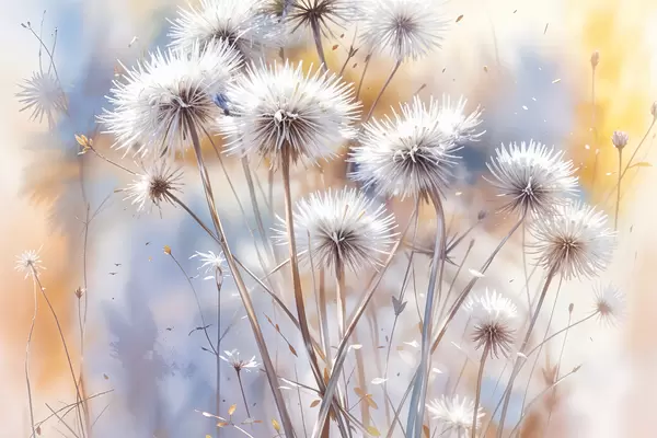 Poster Bolyhos fehér pitypang virágok elmosódott akvarell háttéren meleg világítással Nr f40541