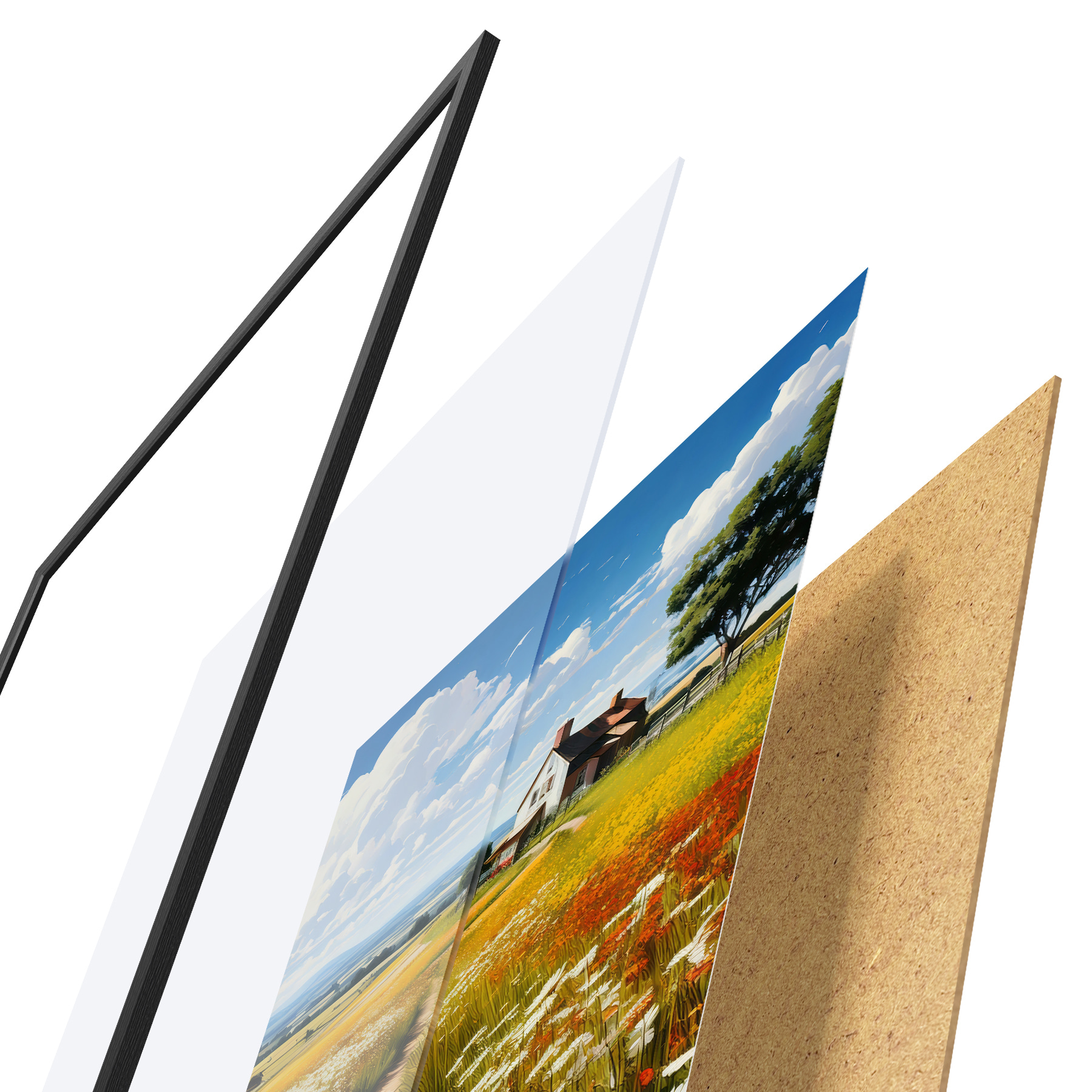 A poszter keretből, plexiből, nyomtatott képből és forgácslap hátlapból áll. A poszter a hátoldalon található rögzítőknek köszönhetően azonnal felakasztható a falra.