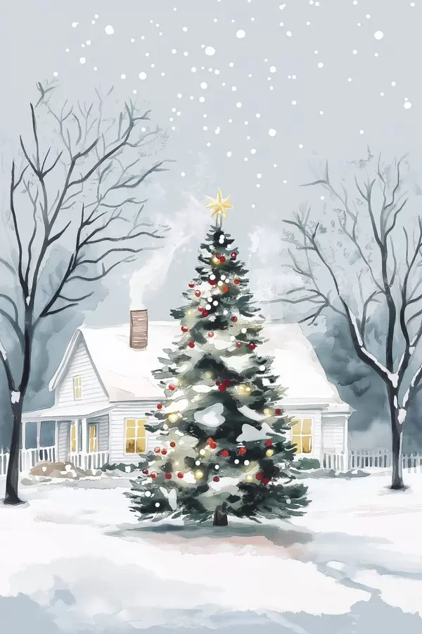 Poster Téli város, feldíszített fenyőfa, karácsony, akvarell Nr f41364