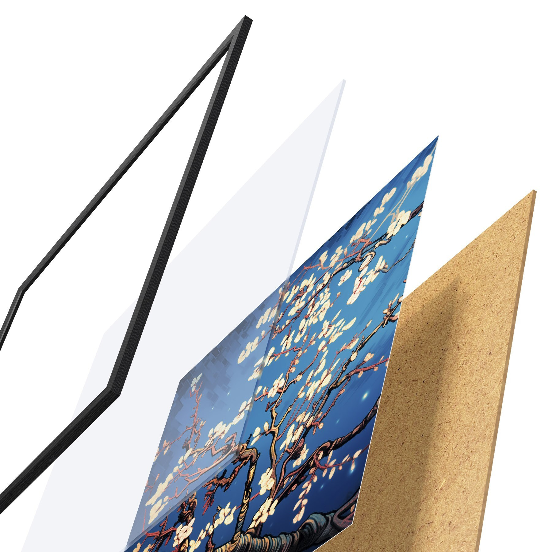 A poszter keretből, plexiből, nyomtatott képből és forgácslap hátlapból áll. A poszter a hátoldalon található rögzítőknek köszönhetően azonnal felakasztható a falra.