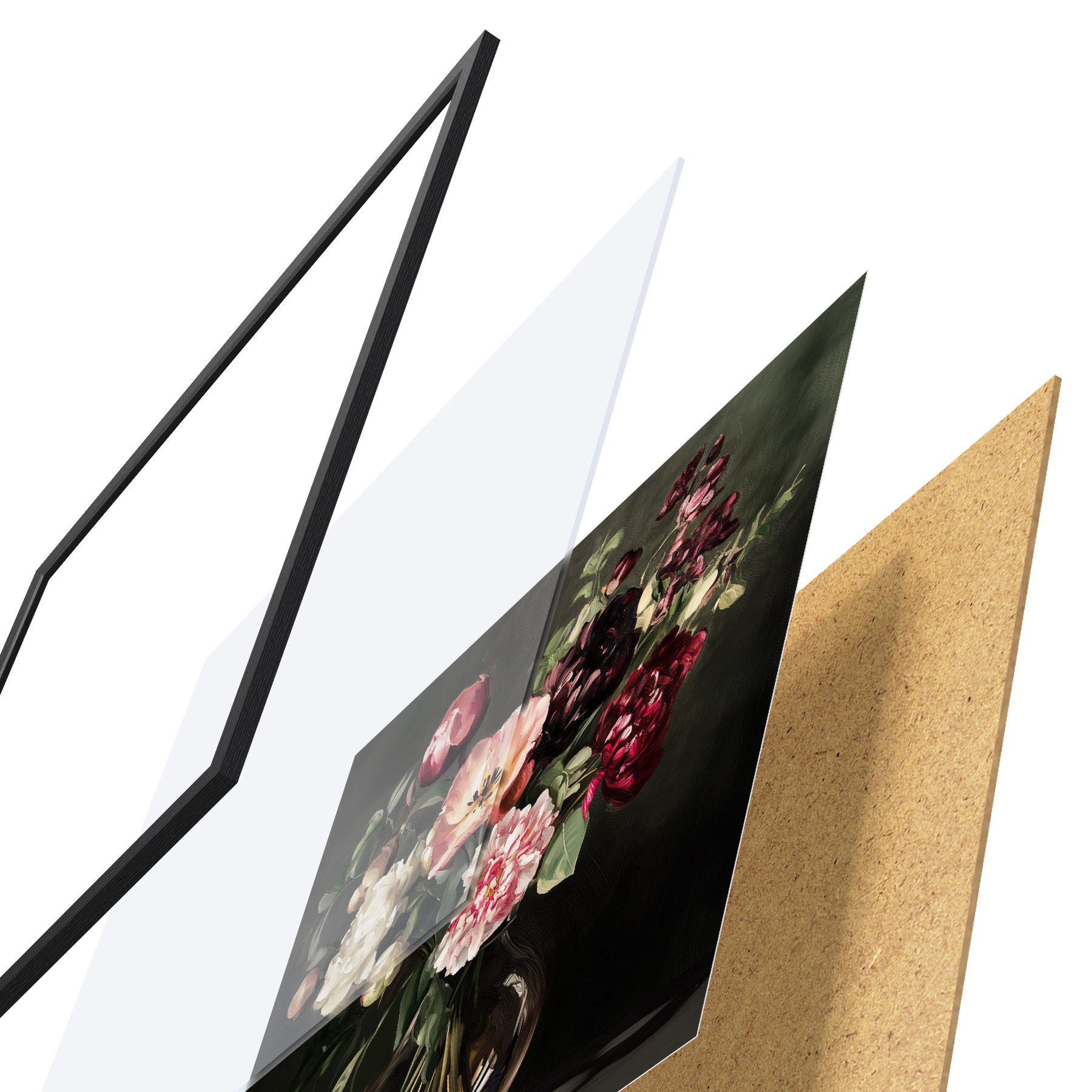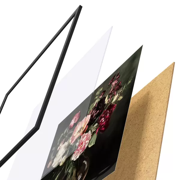 A poszter keretből, plexiből, nyomtatott képből és forgácslap hátlapból áll. A poszter a hátoldalon található rögzítőknek köszönhetően azonnal felakasztható a falra.