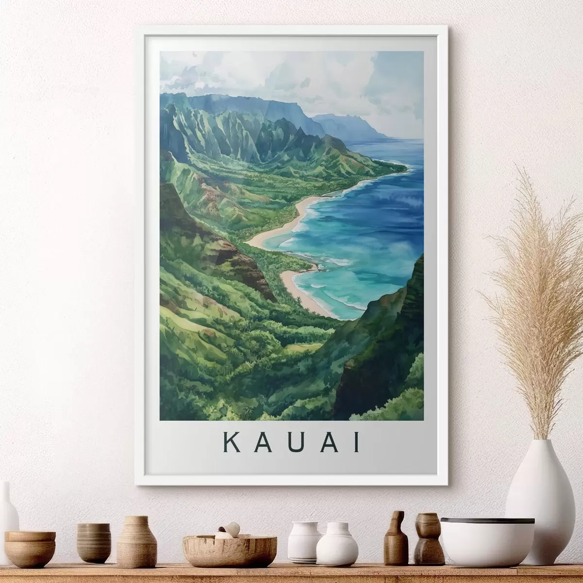 Poster Zöld hegyek, Hawaii, óceán, trópusi, akvarell stílusban Nr f44143