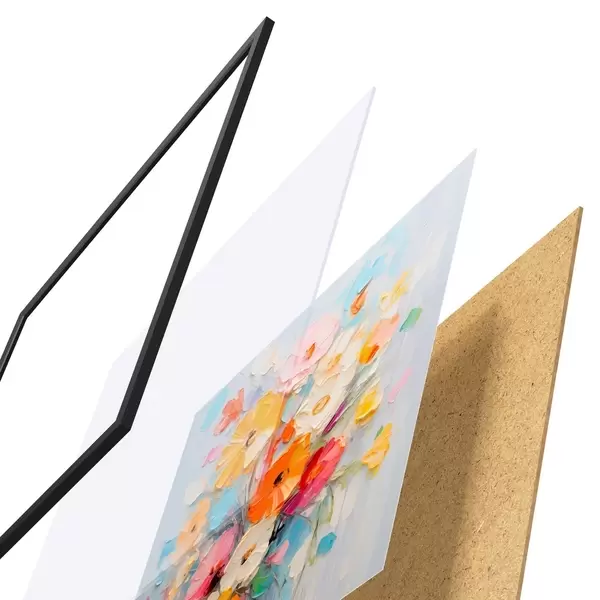 A poszter keretből, plexiből, nyomtatott képből és forgácslap hátlapból áll. A poszter a hátoldalon található rögzítőknek köszönhetően azonnal felakasztható a falra.