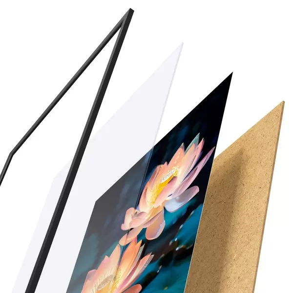 A poszter keretből, plexiből, nyomtatott képből és forgácslap hátlapból áll. A poszter a hátoldalon található rögzítőknek köszönhetően azonnal felakasztható a falra.