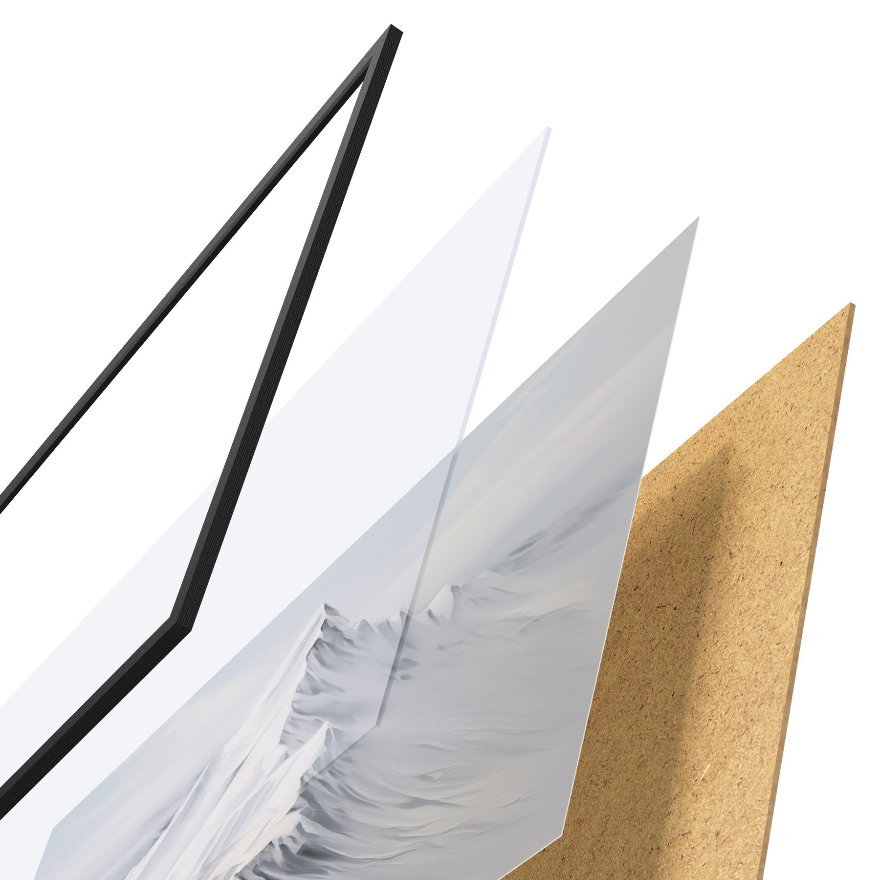 A poszter keretből, plexiből, nyomtatott képből és forgácslap hátlapból áll. A poszter a hátoldalon található rögzítőknek köszönhetően azonnal felakasztható a falra.