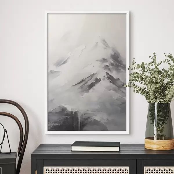 Plakát a sziklán Havas hegycsúcsok szürke árnyékokkal, szürke ég, ecsetvonások, texturált, minimalista f45932