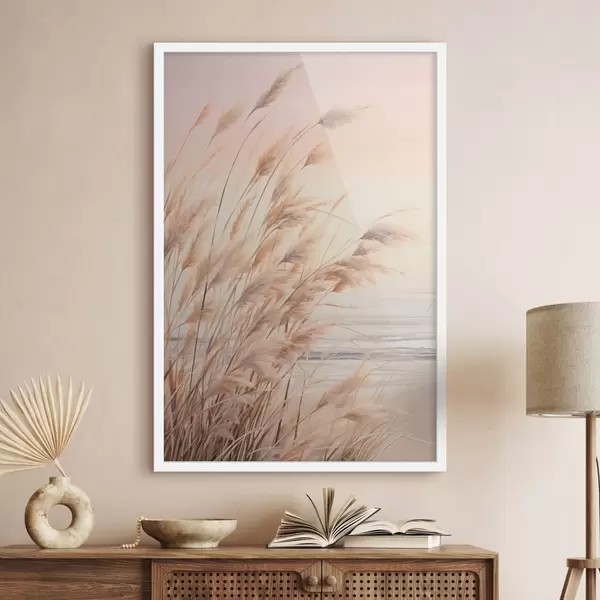 Plakát a sziklán Pampas fű pasztell narancssárga színpalettával, világos rózsaszín égbolttal, nyugodt tájjal f45934