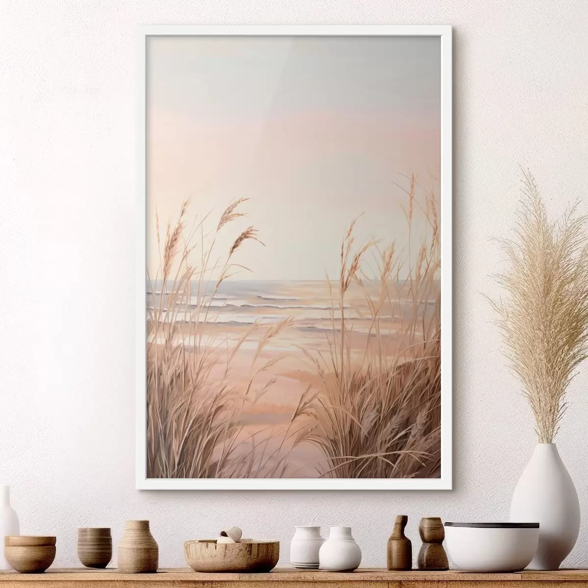 Plakát a sziklán Pampas fű pasztell narancssárga színpalettával, világos rózsaszín égbolttal, nyugodt tájjal f45935
