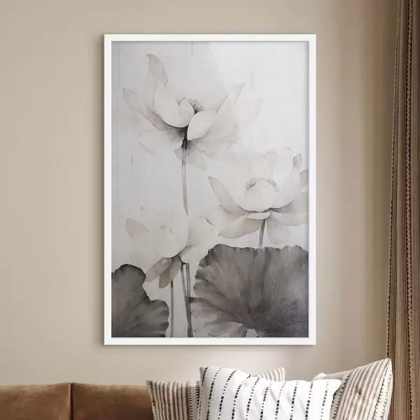 Poster Fehér textúrájú lótuszvirágok sötét levelekkel, világos háttérrel, minimalista dizájn Nr f45936