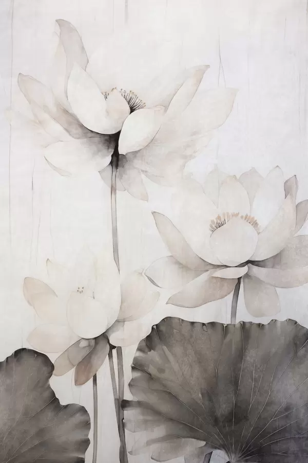 Poster Fehér textúrájú lótuszvirágok sötét levelekkel, világos háttérrel, minimalista dizájn Nr f45936