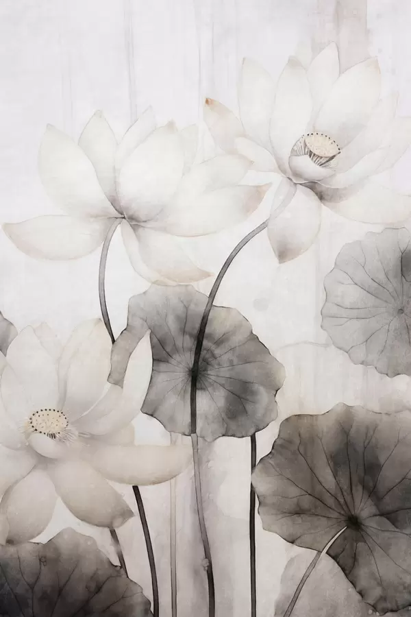 Poster Fehér textúrájú lótuszvirágok sötét levelekkel, világos háttérrel, minimalista dizájn Nr f45937