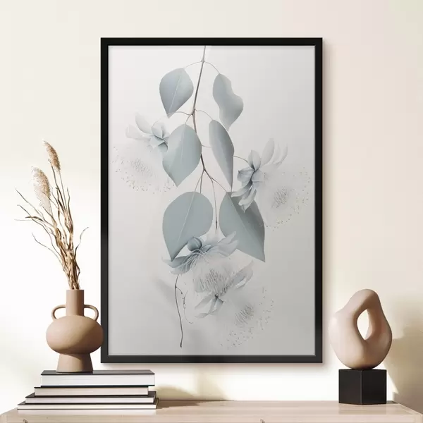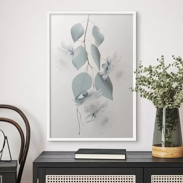 Poster Eukaliptusz ág kék levelekkel és fehér virágokkal, világos háttérrel Nr f45947