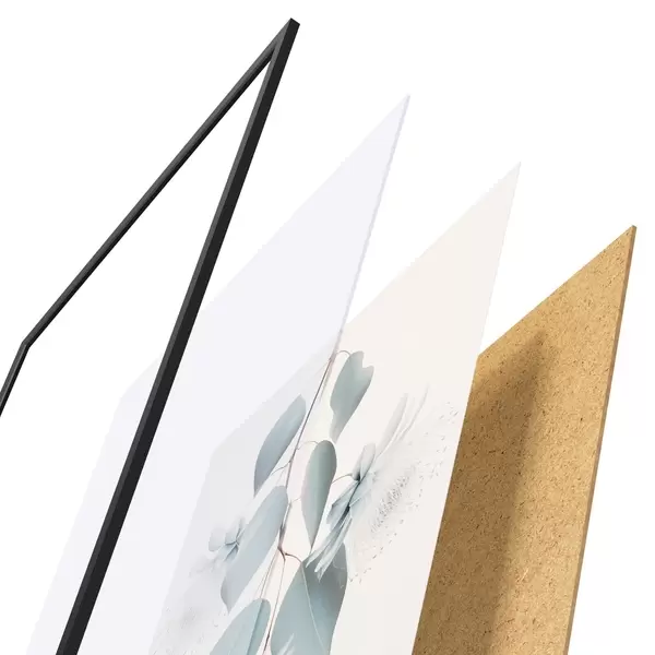 A poszter keretből, plexiből, nyomtatott képből és forgácslap hátlapból áll. A poszter a hátoldalon található rögzítőknek köszönhetően azonnal felakasztható a falra.