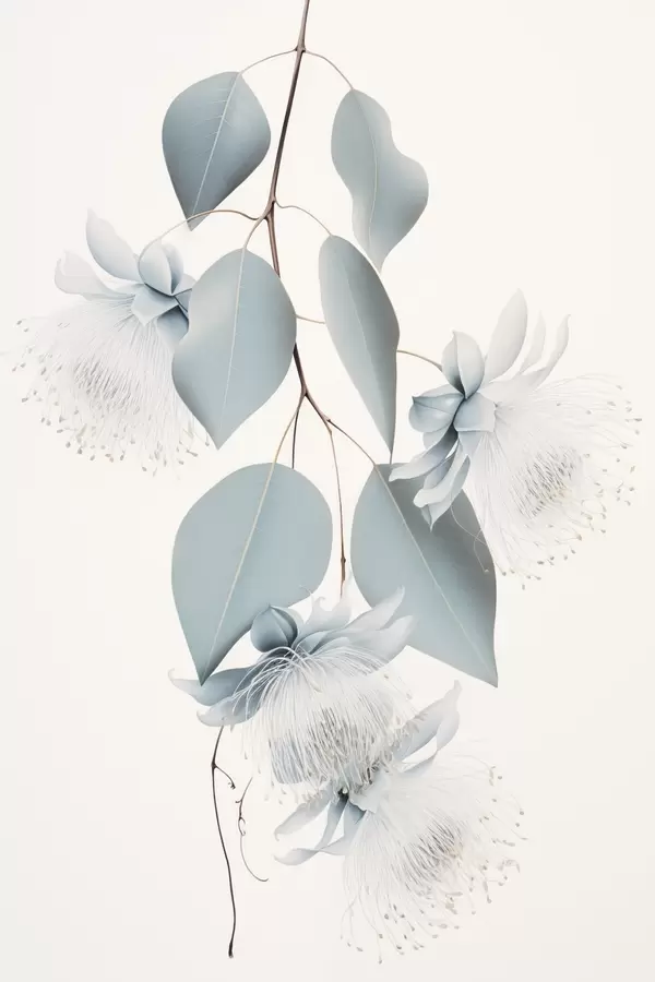 Poster Eukaliptusz ág kék levelekkel és fehér virágokkal, világos háttérrel Nr f45947