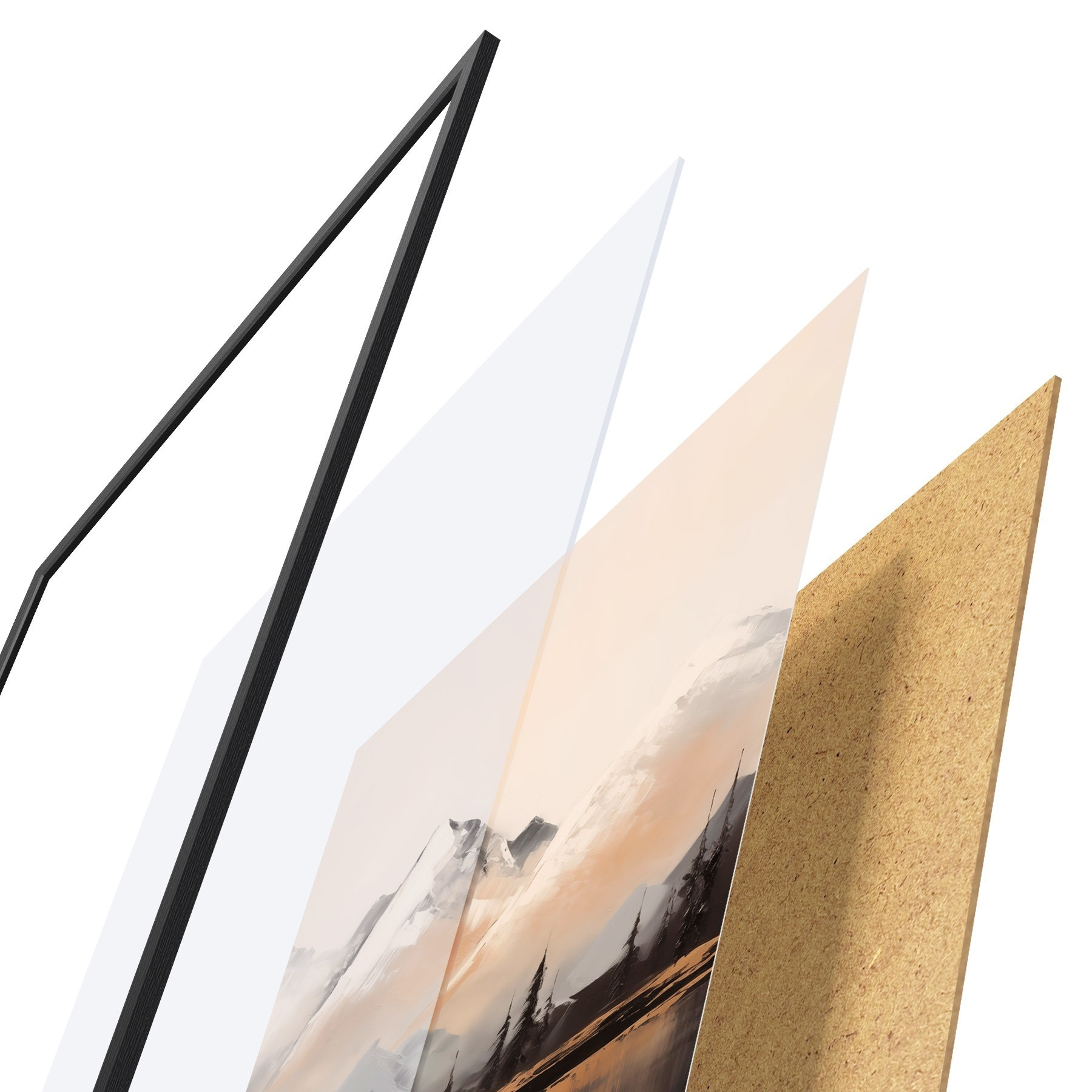 A poszter keretből, plexiből, nyomtatott képből és forgácslap hátlapból áll. A poszter a hátoldalon található rögzítőknek köszönhetően azonnal felakasztható a falra.