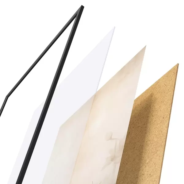 A poszter keretből, plexiből, nyomtatott képből és forgácslap hátlapból áll. A poszter a hátoldalon található rögzítőknek köszönhetően azonnal felakasztható a falra.