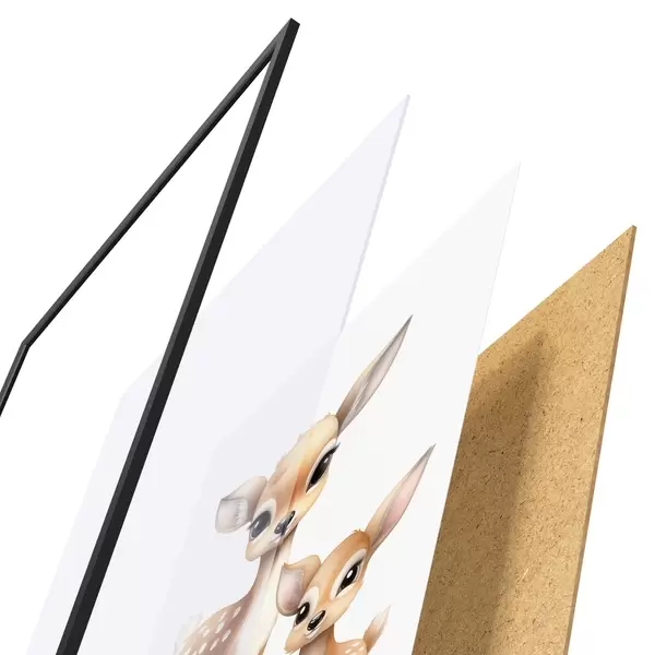 A poszter keretből, plexiből, nyomtatott képből és forgácslap hátlapból áll. A poszter a hátoldalon található rögzítőknek köszönhetően azonnal felakasztható a falra.