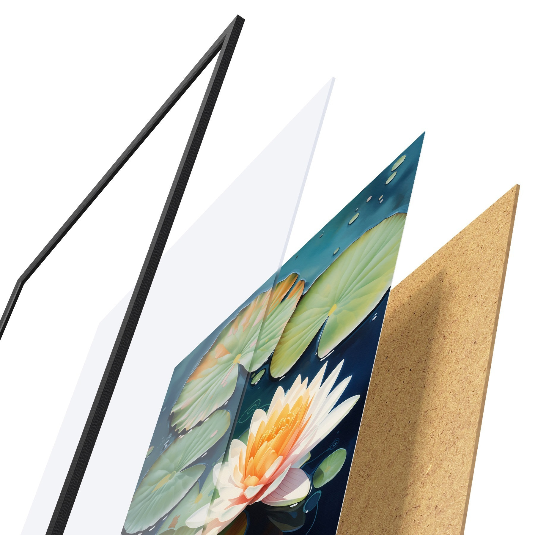 A poszter keretből, plexiből, nyomtatott képből és forgácslap hátlapból áll. A poszter a hátoldalon található rögzítőknek köszönhetően azonnal felakasztható a falra.