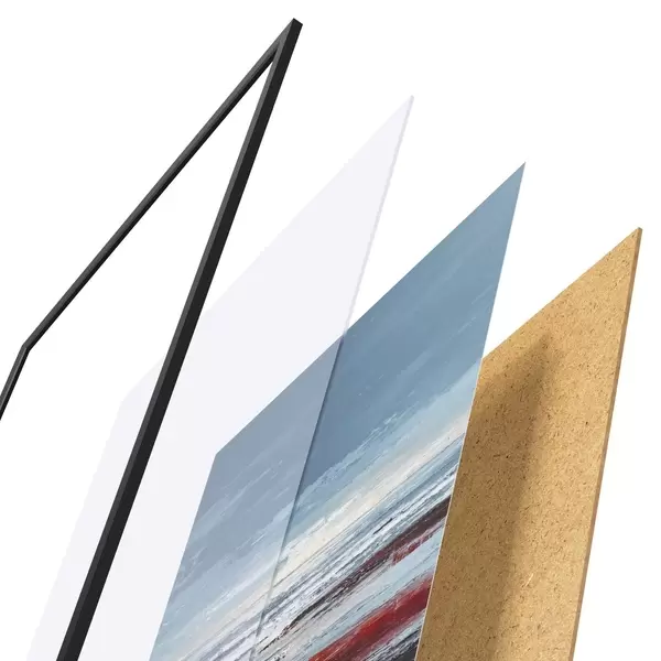 A poszter keretből, plexiből, nyomtatott képből és forgácslap hátlapból áll. A poszter a hátoldalon található rögzítőknek köszönhetően azonnal felakasztható a falra.