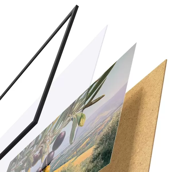 A poszter keretből, plexiből, nyomtatott képből és forgácslap hátlapból áll. A poszter a hátoldalon található rögzítőknek köszönhetően azonnal felakasztható a falra.