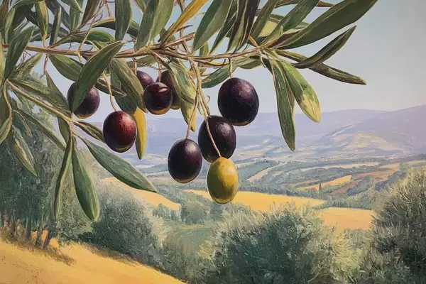 Poster Olajág sötét gyümölcsökkel nyári táj előtt Nr f46150