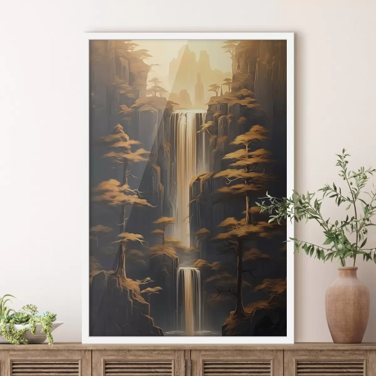 Plakát a sziklán Magas sziklák vízeséssel és fenyőkkel az esti fényben f46151