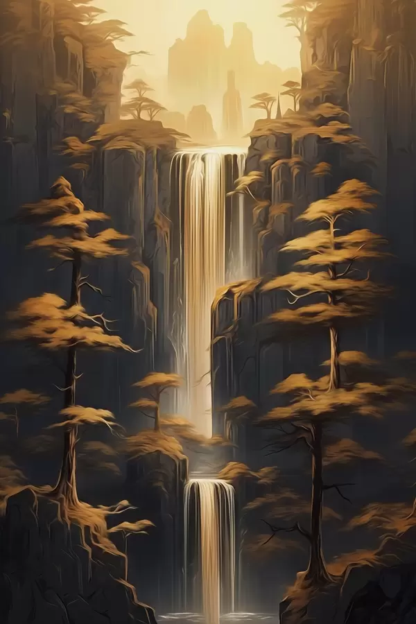 Poster Magas sziklák vízeséssel és fenyőkkel az esti fényben Nr f46151