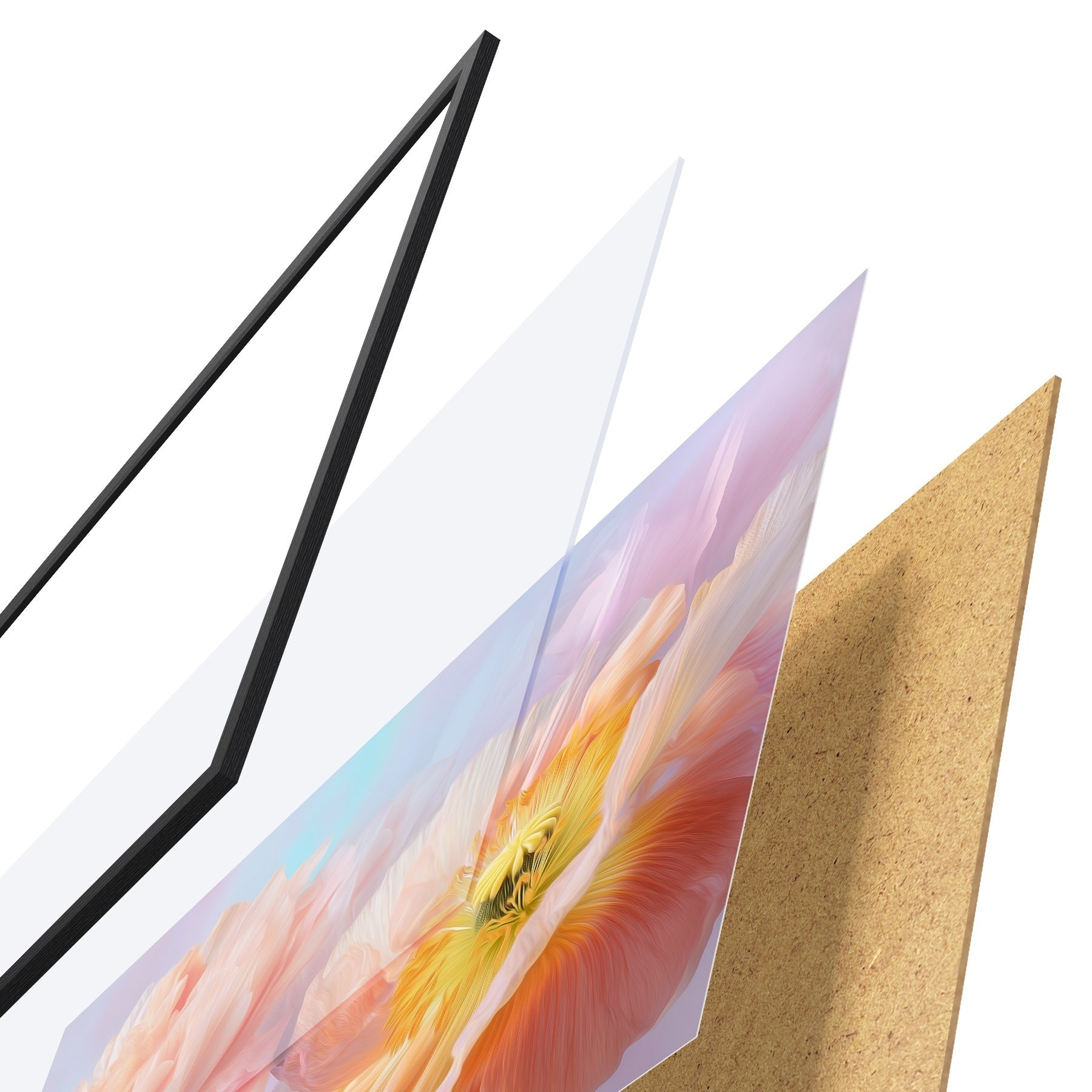 A poszter keretből, plexiből, nyomtatott képből és forgácslap hátlapból áll. A poszter a hátoldalon található rögzítőknek köszönhetően azonnal felakasztható a falra.