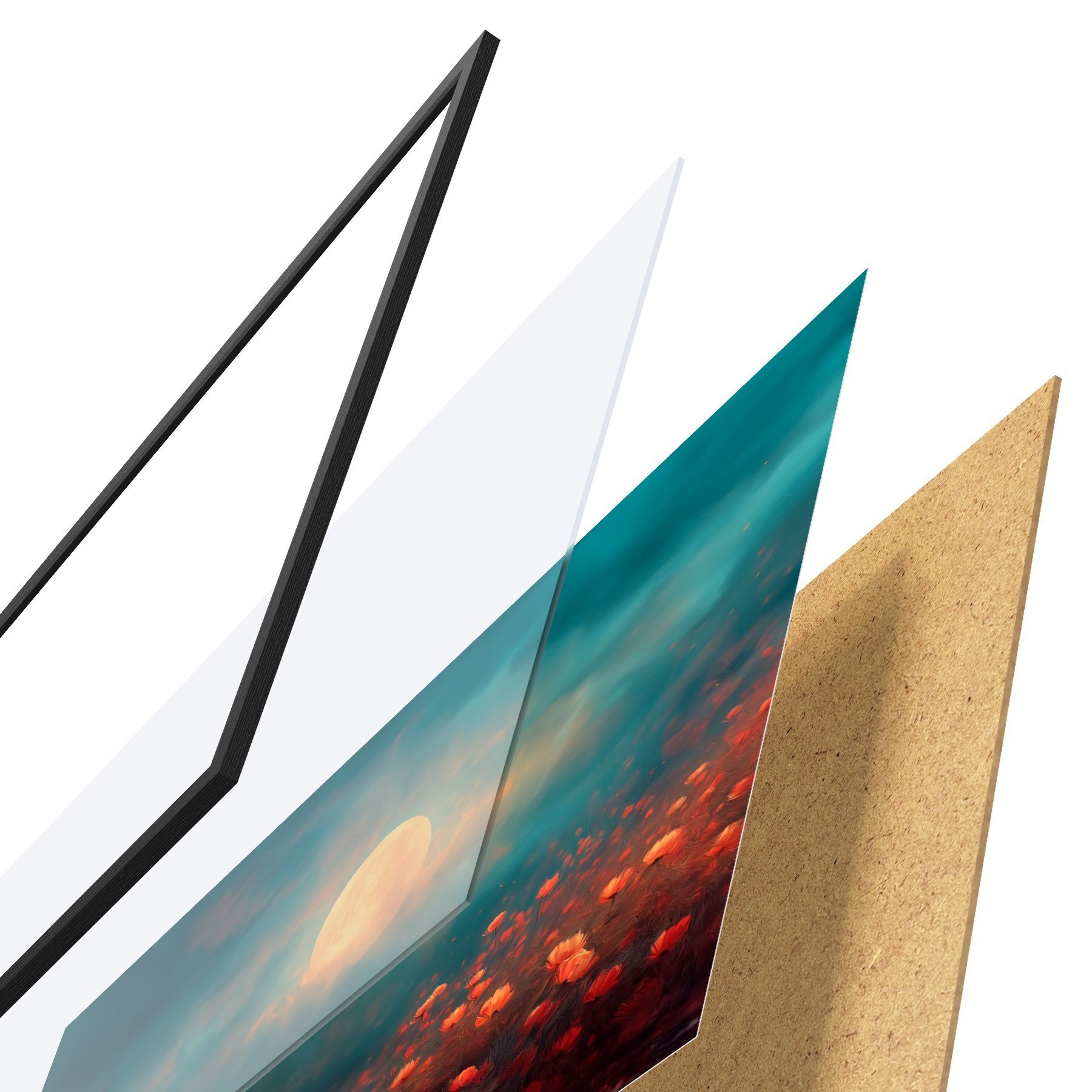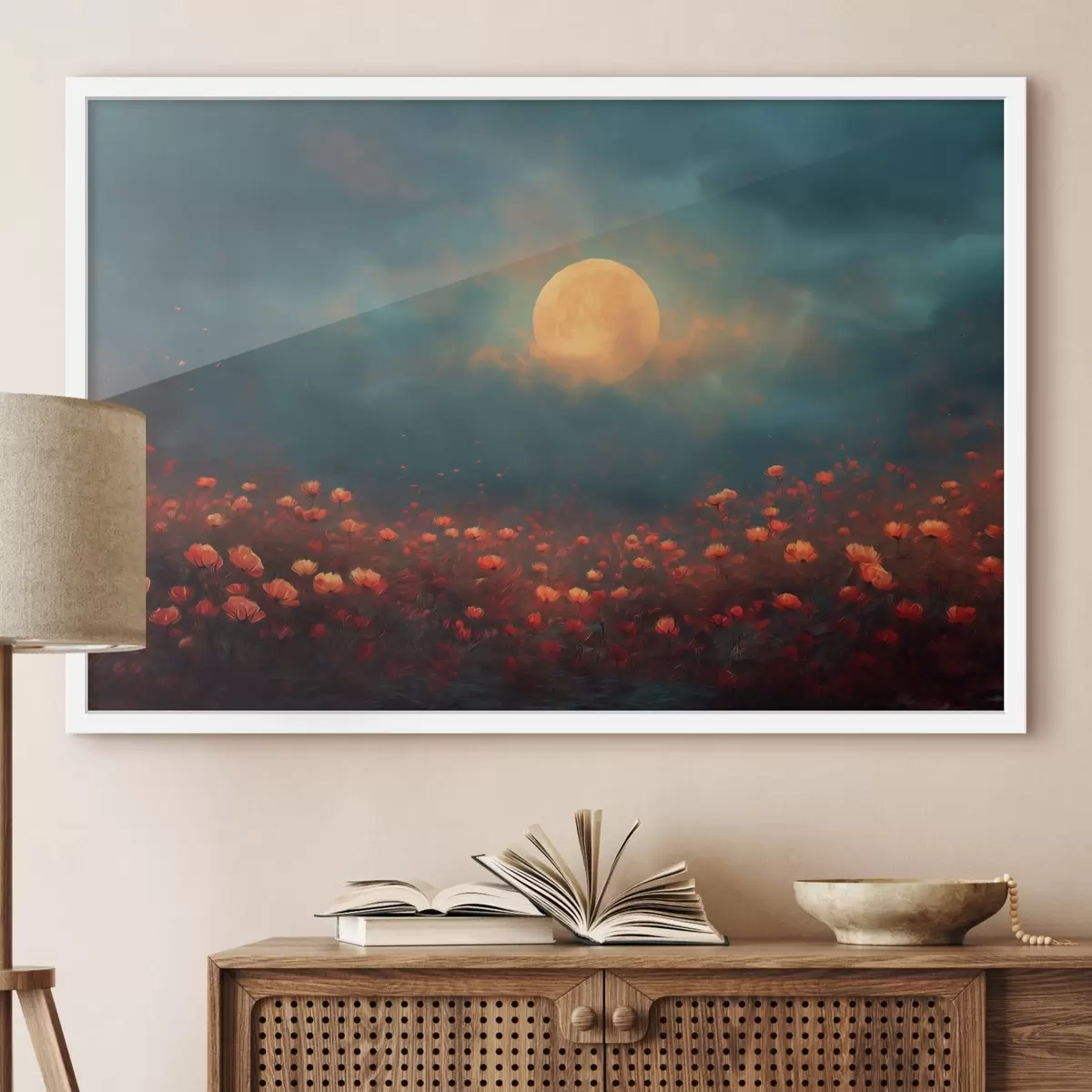 Poster Hold a ködös esti égbolton, vörös virágok mezője felett Nr f46167