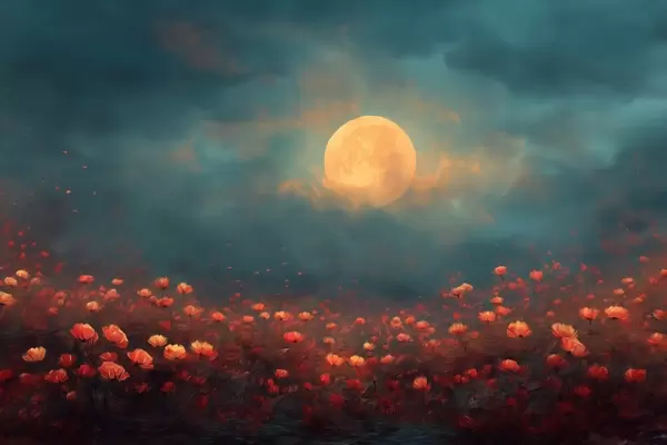 Plakát a sziklán Hold a ködös esti égbolton, vörös virágok mezője felett f46167