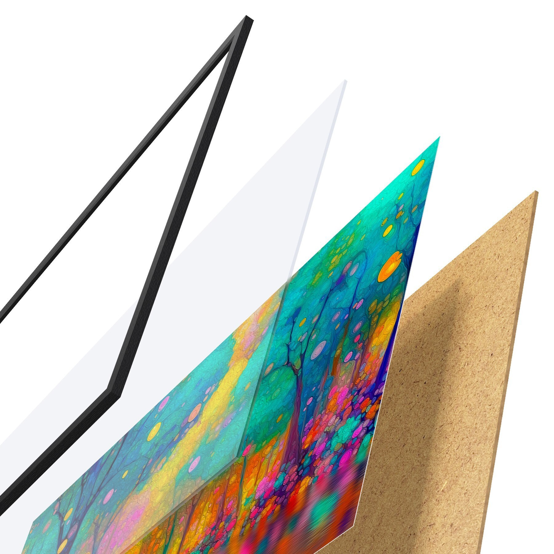 A poszter keretből, plexiből, nyomtatott képből és forgácslap hátlapból áll. A poszter a hátoldalon található rögzítőknek köszönhetően azonnal felakasztható a falra.
