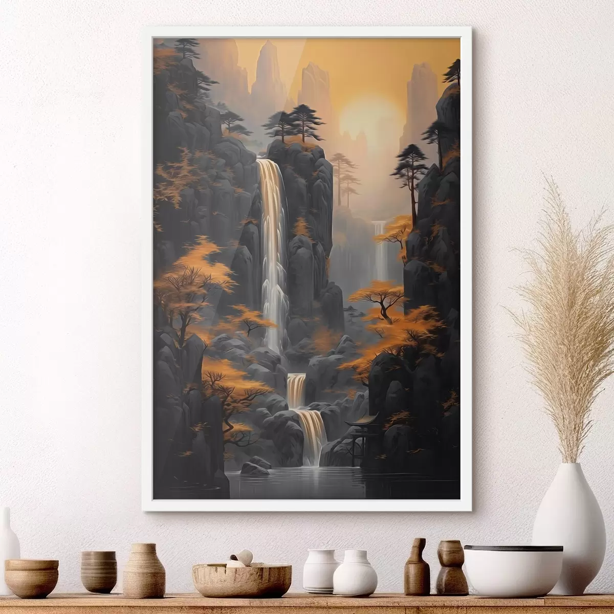 Poster Sziklás táj vízeséssel, meleg naplemente színekben Nr f46177
