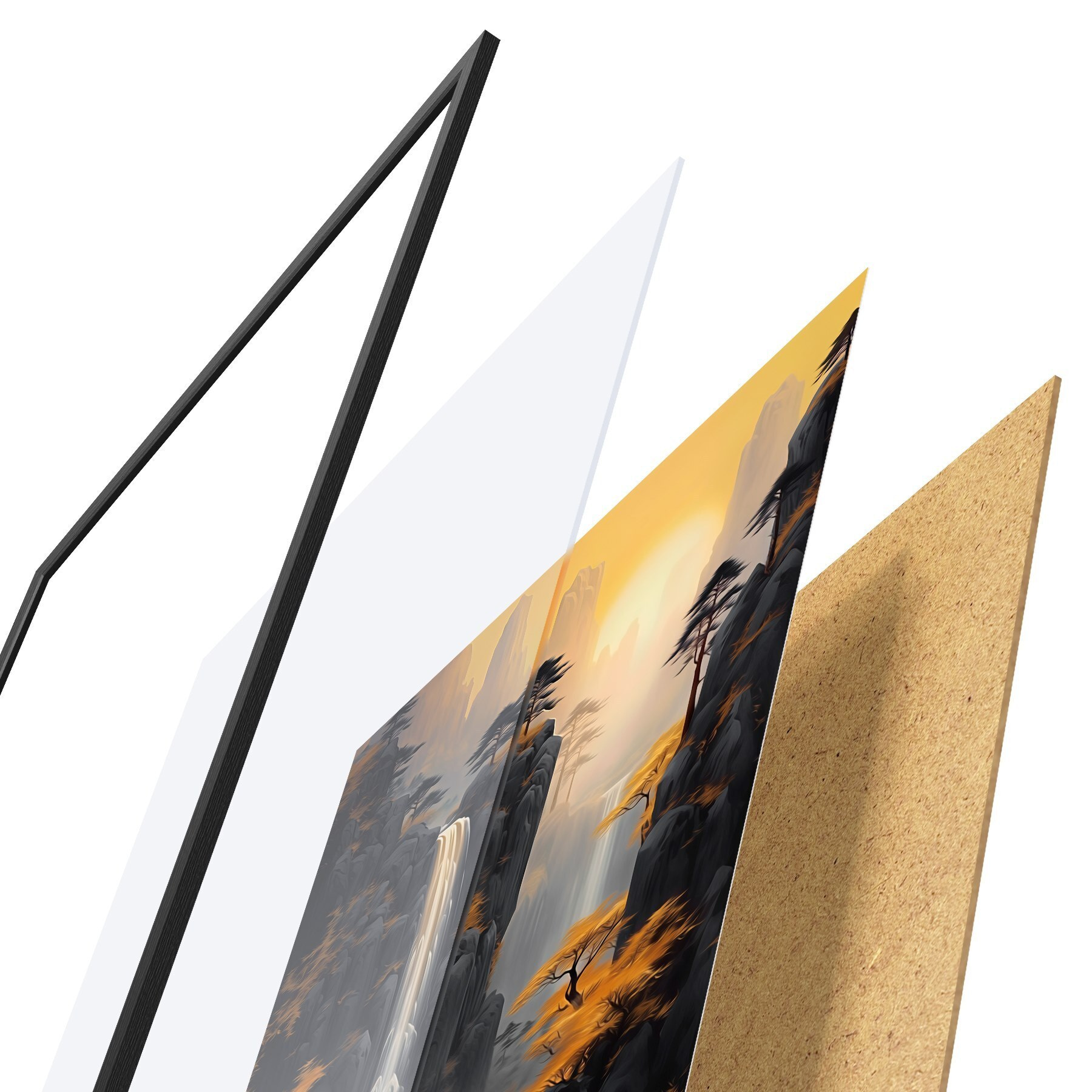 Plakát a sziklán Sziklás táj vízeséssel, meleg naplemente színekben f46177