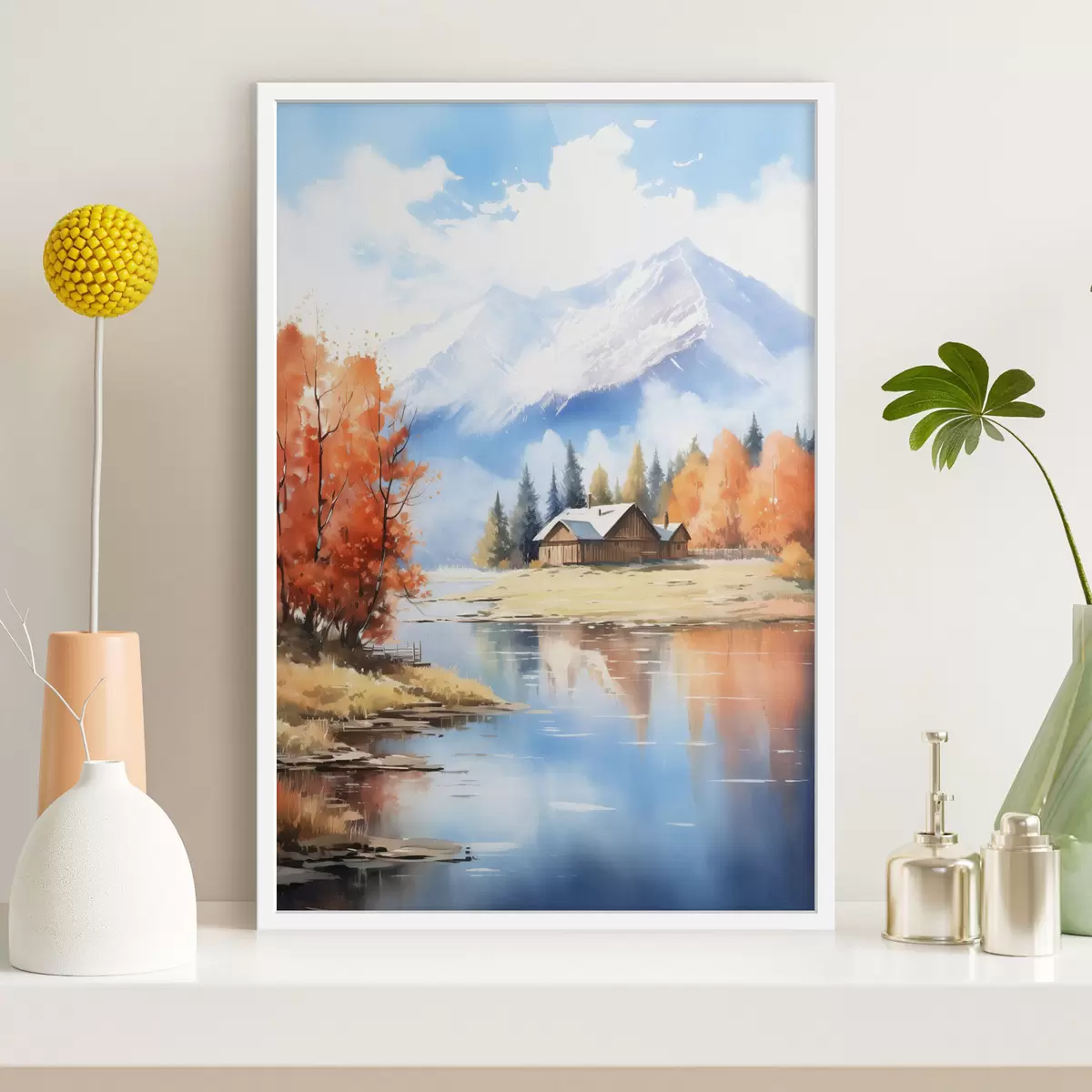 Poster Őszi táj a tó partján, házzal és hegyekkel Nr f46184