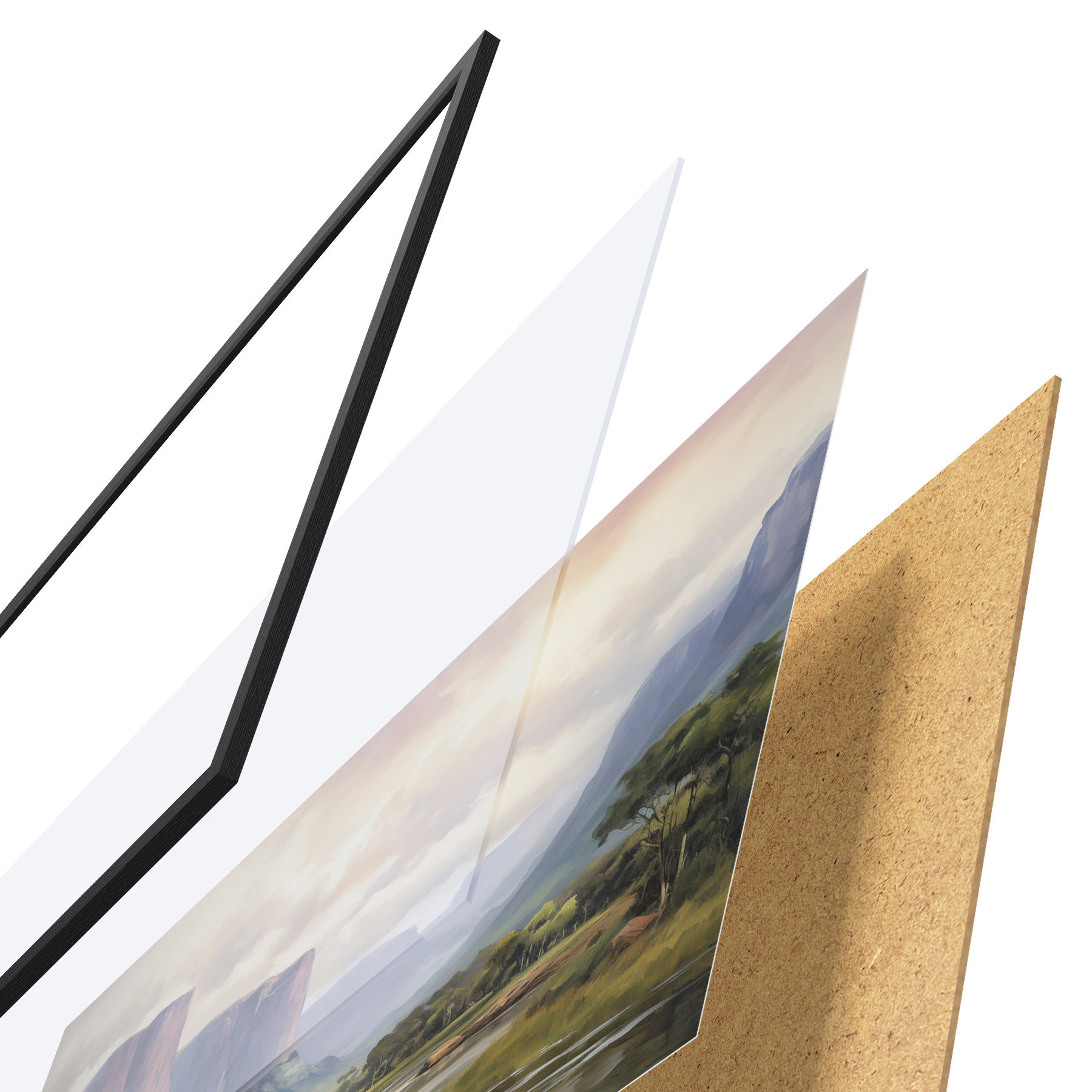 A poszter keretből, plexiből, nyomtatott képből és forgácslap hátlapból áll. A poszter a hátoldalon található rögzítőknek köszönhetően azonnal felakasztható a falra.