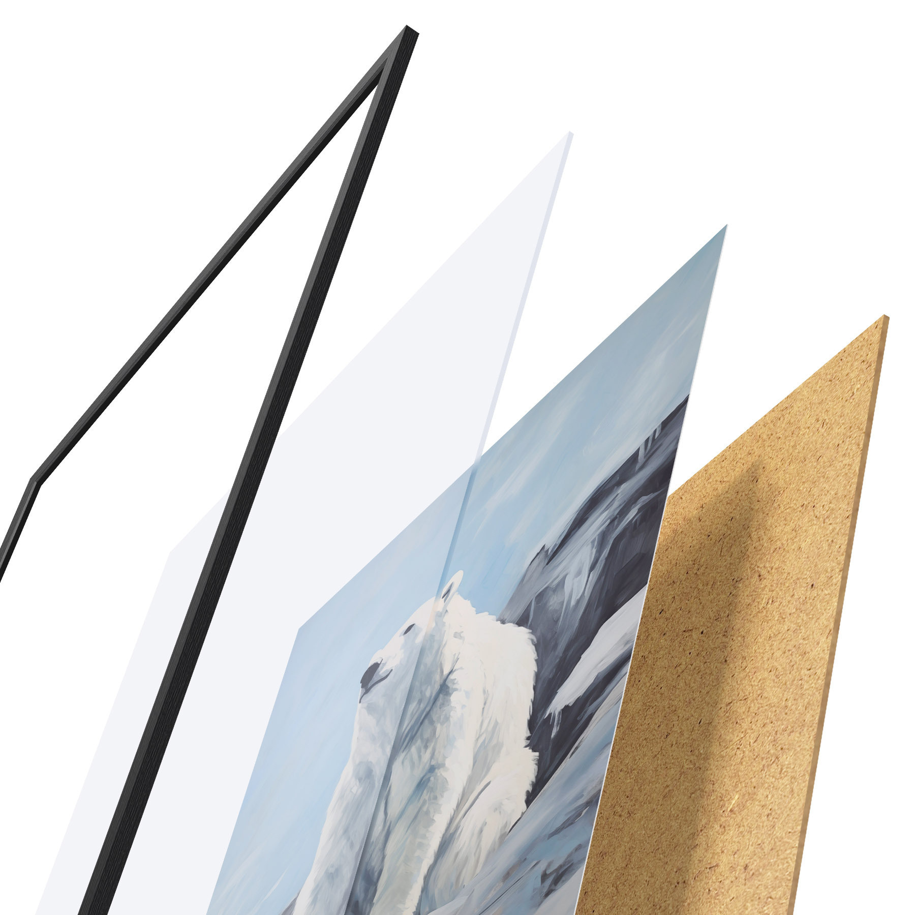A poszter keretből, plexiből, nyomtatott képből és forgácslap hátlapból áll. A poszter a hátoldalon található rögzítőknek köszönhetően azonnal felakasztható a falra.