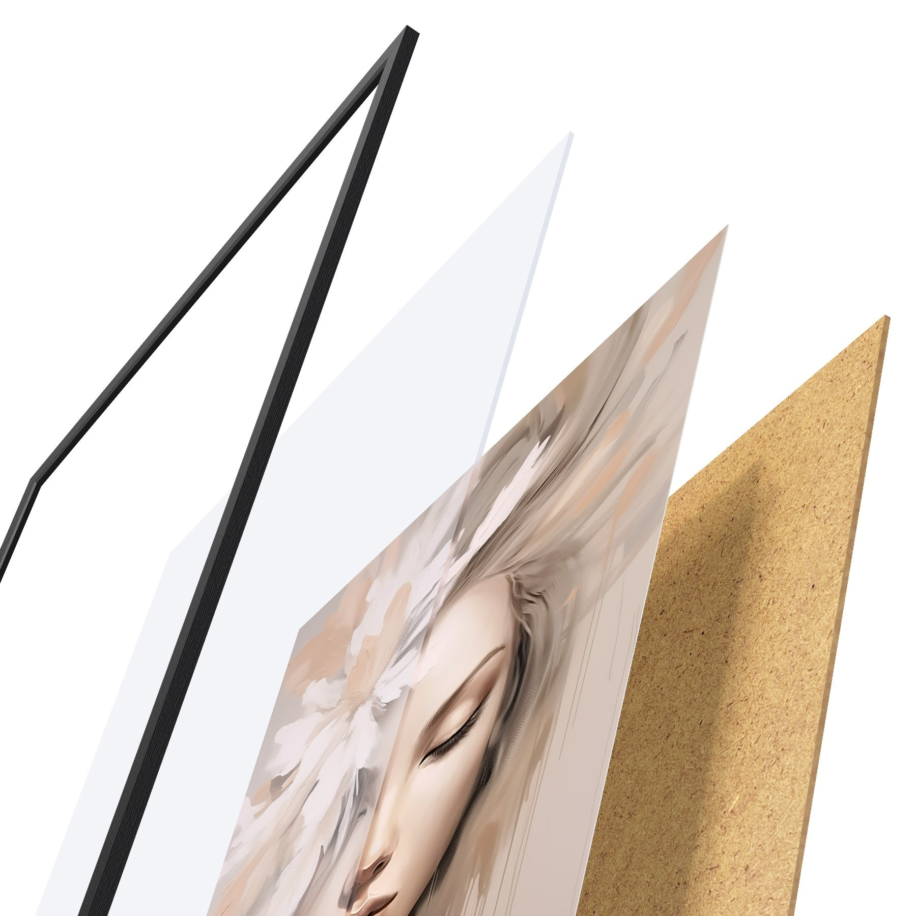 A poszter keretből, plexiből, nyomtatott képből és forgácslap hátlapból áll. A poszter a hátoldalon található rögzítőknek köszönhetően azonnal felakasztható a falra.