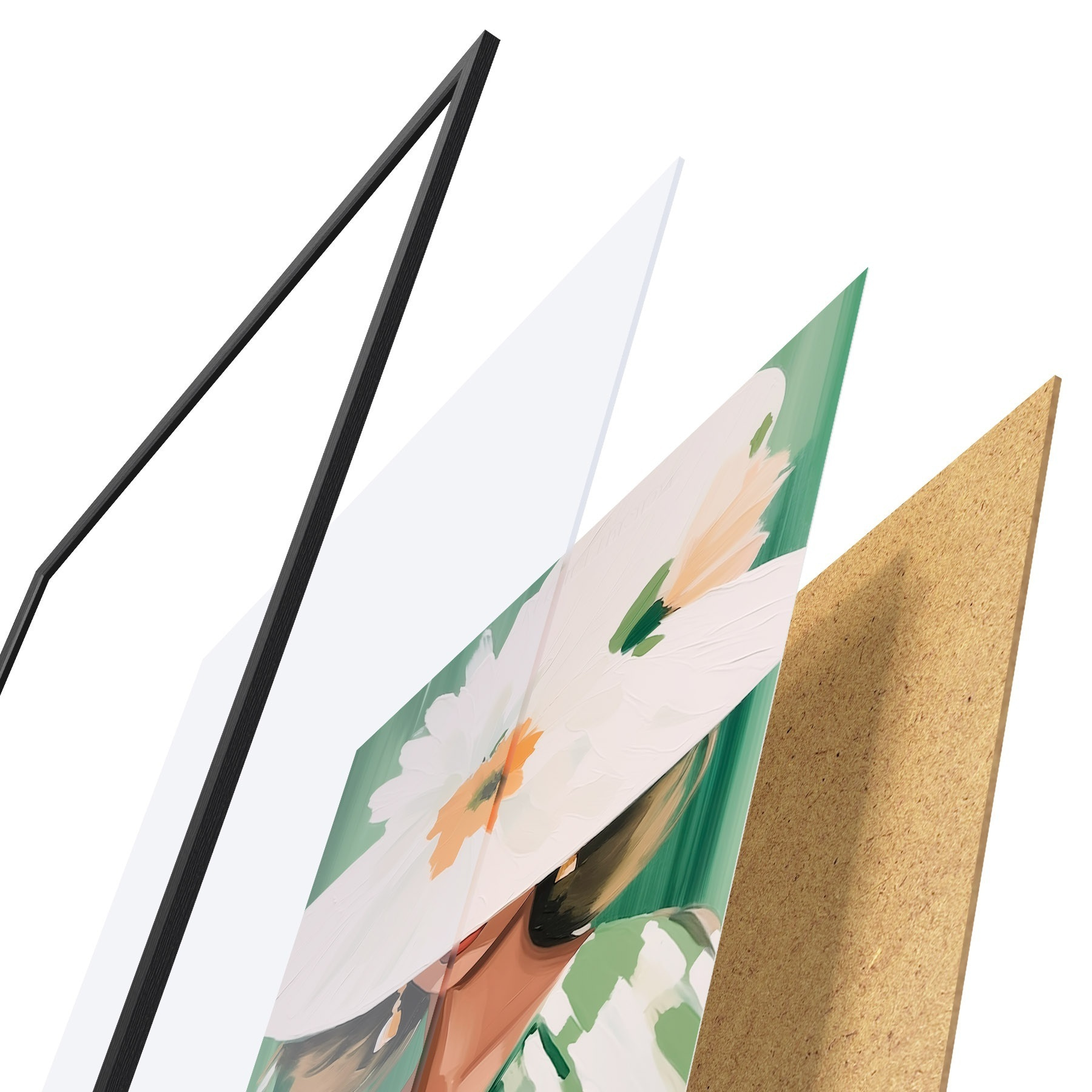 A poszter keretből, plexiből, nyomtatott képből és forgácslap hátlapból áll. A poszter a hátoldalon található rögzítőknek köszönhetően azonnal felakasztható a falra.