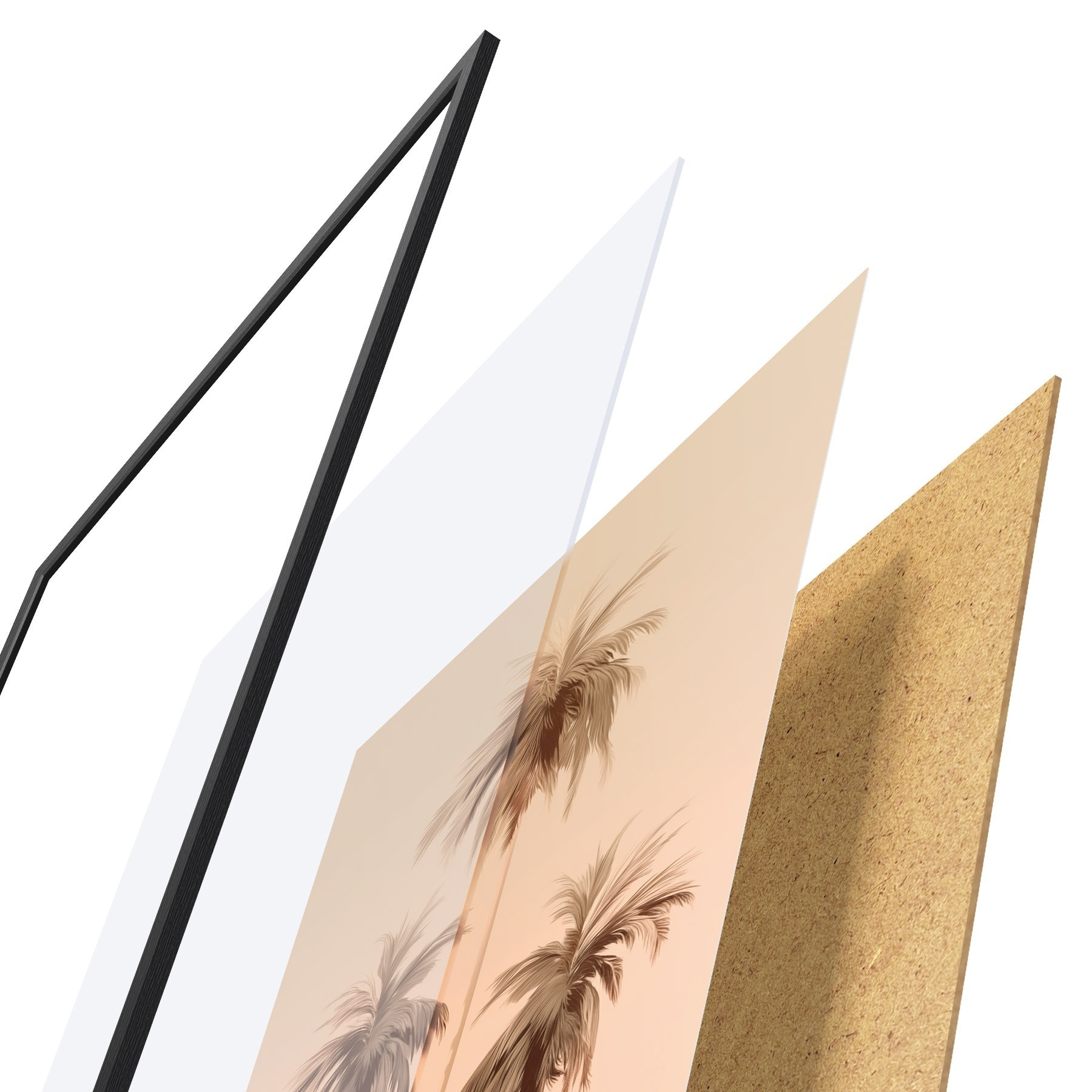 A poszter keretből, plexiből, nyomtatott képből és forgácslap hátlapból áll. A poszter a hátoldalon található rögzítőknek köszönhetően azonnal felakasztható a falra.