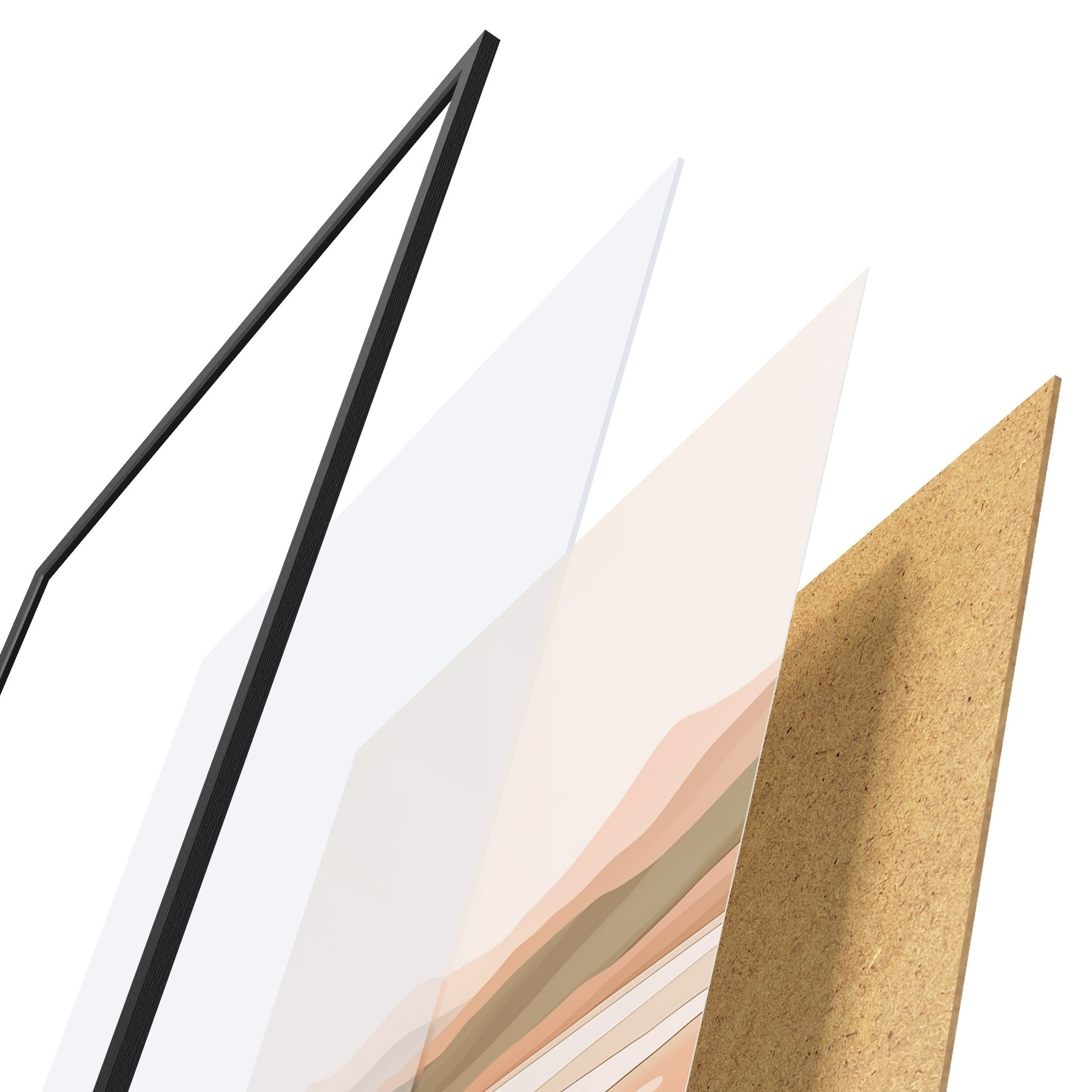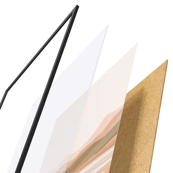 A poszter keretből, plexiből, nyomtatott képből és forgácslap hátlapból áll. A poszter a hátoldalon található rögzítőknek köszönhetően azonnal felakasztható a falra.