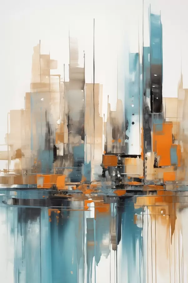 Plakát a sziklán Absztrakt városi tájkép narancssárga, türkizkék és barna színű, függőleges ecsetvonásokkal és geometrikus formákkal f46266