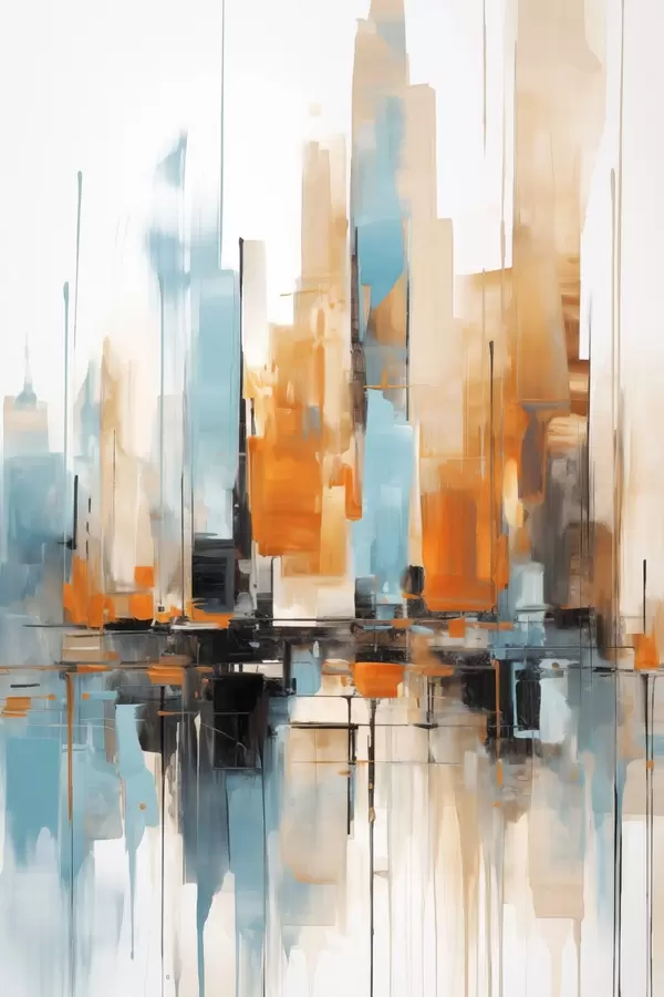 Plakát a sziklán Absztrakt városi tájkép függőleges ecsetvonásokkal narancssárga, kék és fehér árnyalatokban, festészeti stílusban f46267