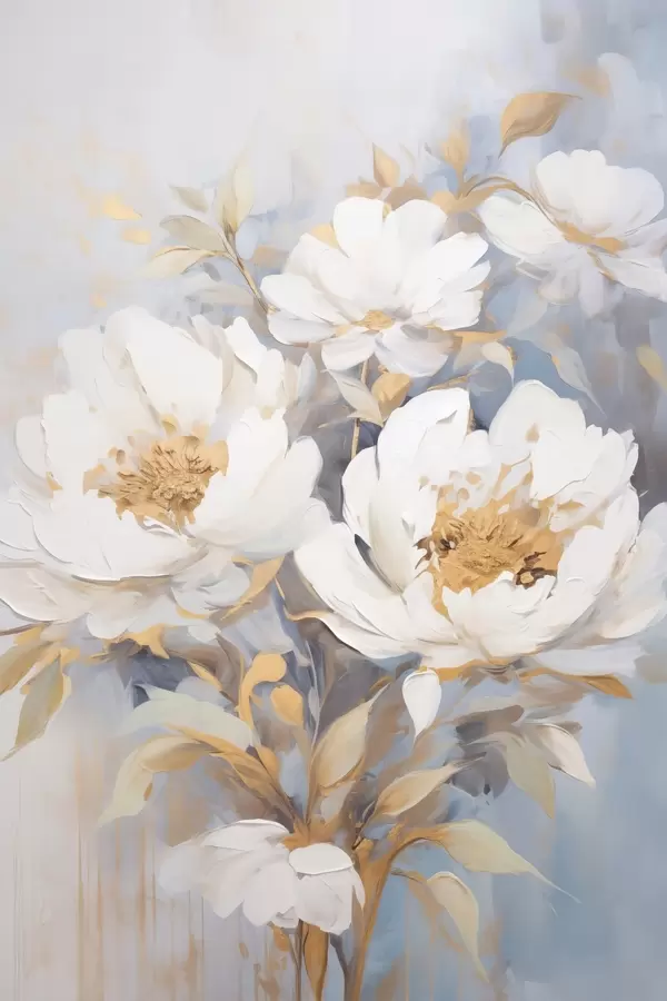 Poster Fehér pünkösdi rózsák kék közepekkel és levelekkel, lágy ecsetvonások, világoskék háttér, virágkompozíció Nr f46270