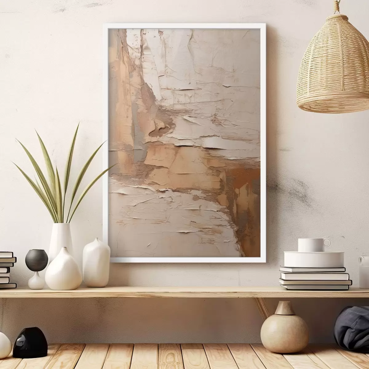 Plakát a sziklán Absztrakt festmény vastag ecsetvonásokkal, bézs és barna tónusokkal, texturált felülettel, semleges színpalettával f46273