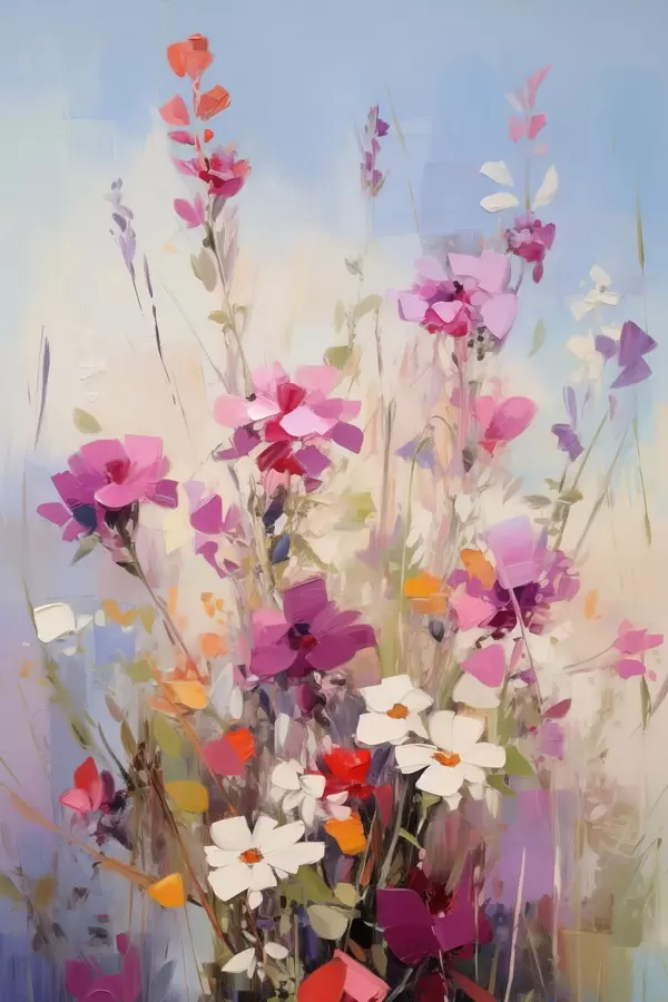 Plakát a sziklán Élénk rózsaszín, fehér és zöld virágok lágy, pasztellszínű háttér előtt f46278