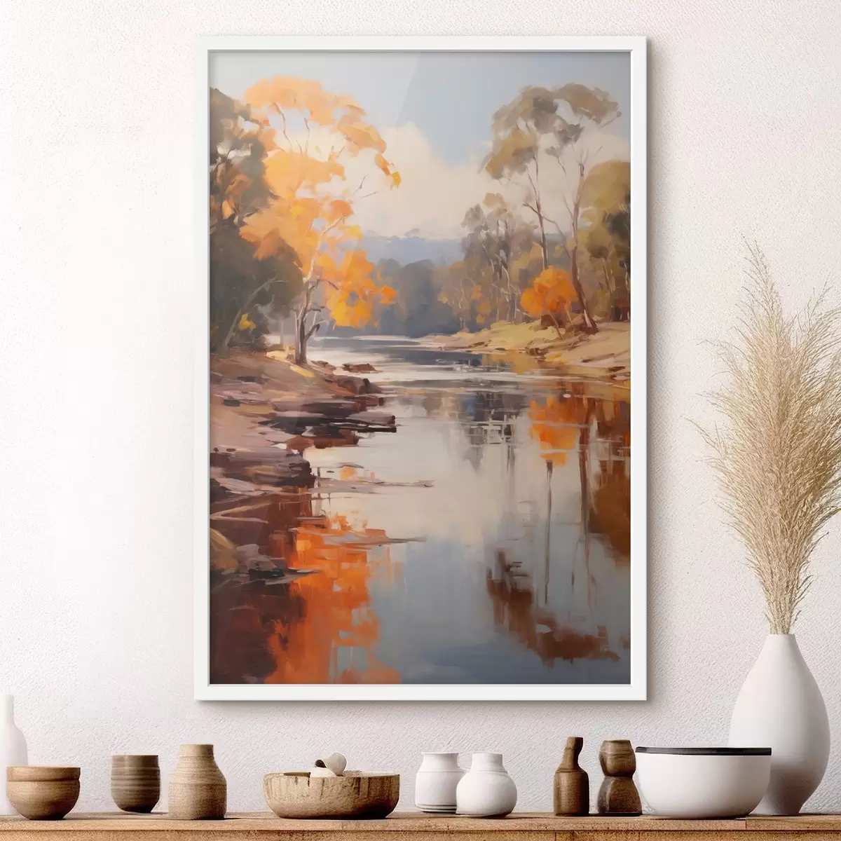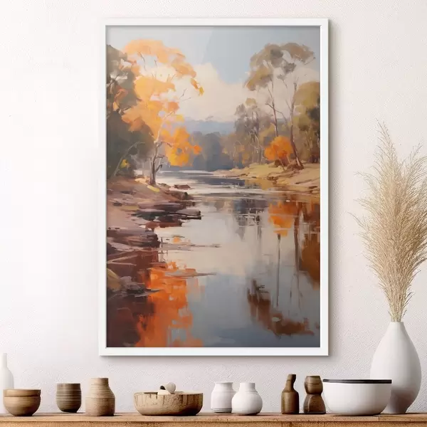 Poster Őszi táj, folyó fákkal a partján, erdő a háttérben, tükröződések a vízen Nr f46280